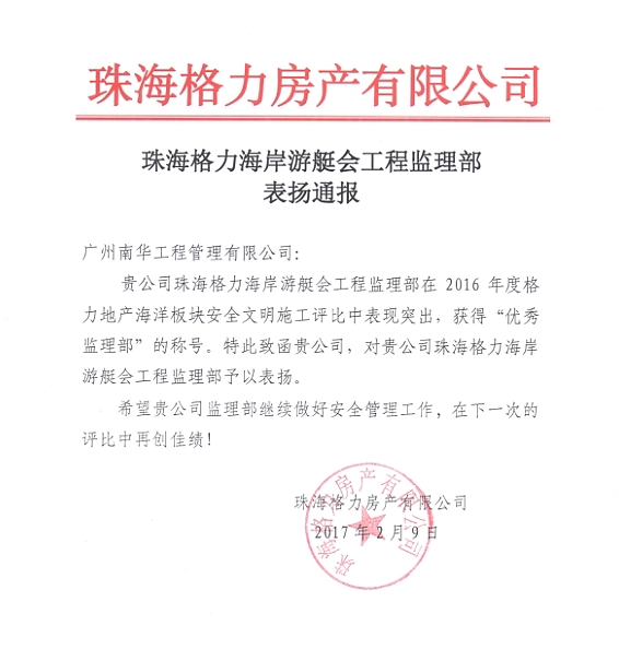 2017年2月9日,珠海格力房產(chǎn)有限公司傳來(lái)好消息,珠海格力海岸游艇會(huì)工程監(jiān)理部在2016年度格力地產(chǎn)海洋板塊安全文明施工評(píng)比中表現(xiàn)突出,獲得“優(yōu)秀監(jiān)理部”榮譽(yù)稱號(hào),珠海格力房產(chǎn)有限公司對(duì)監(jiān)理部工作給予高度評(píng)價(jià),同時(shí)要求監(jiān)理部再接再厲,繼續(xù)為項(xiàng)目把好安全文明關(guān)、質(zhì)量關(guān),為工程安全、優(yōu)質(zhì)、順利地完成做出新的貢獻(xiàn)。