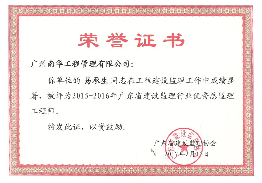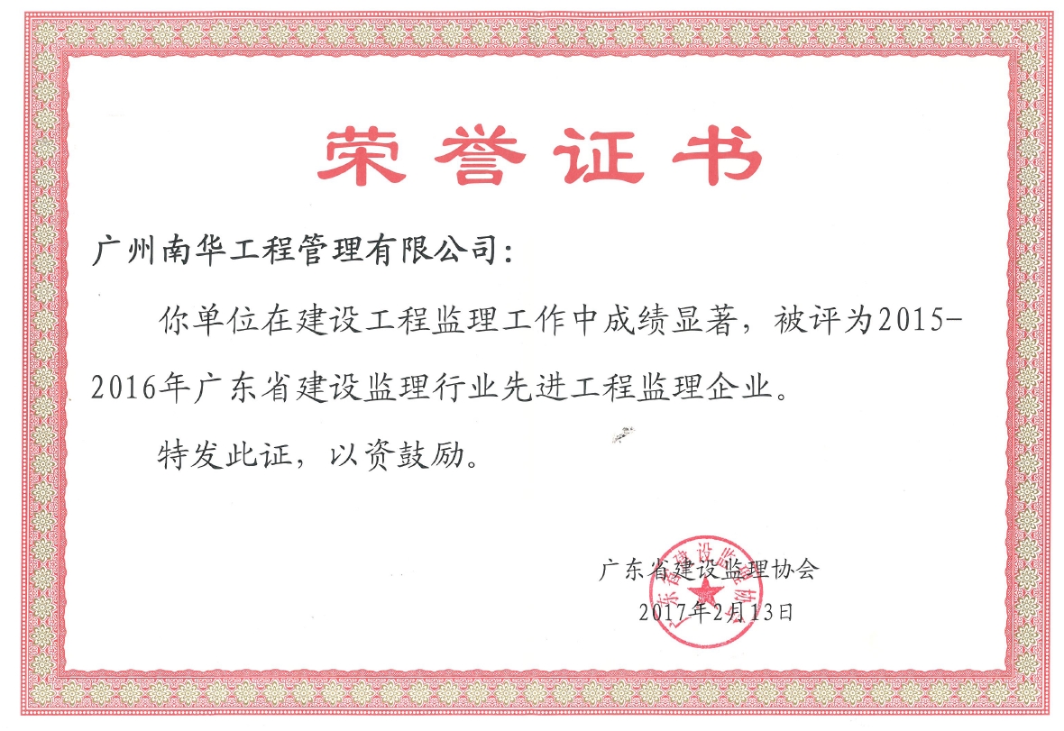 2017年2月13日,廣東省建設監理協會發文,廣州南華工程管理有限公司被評為“2015-2016年廣東省建設監理行業先進工程監理企業”,公司員工易承生被評為“2015-2016年廣東省建設監理行業優秀總監理工程師”。