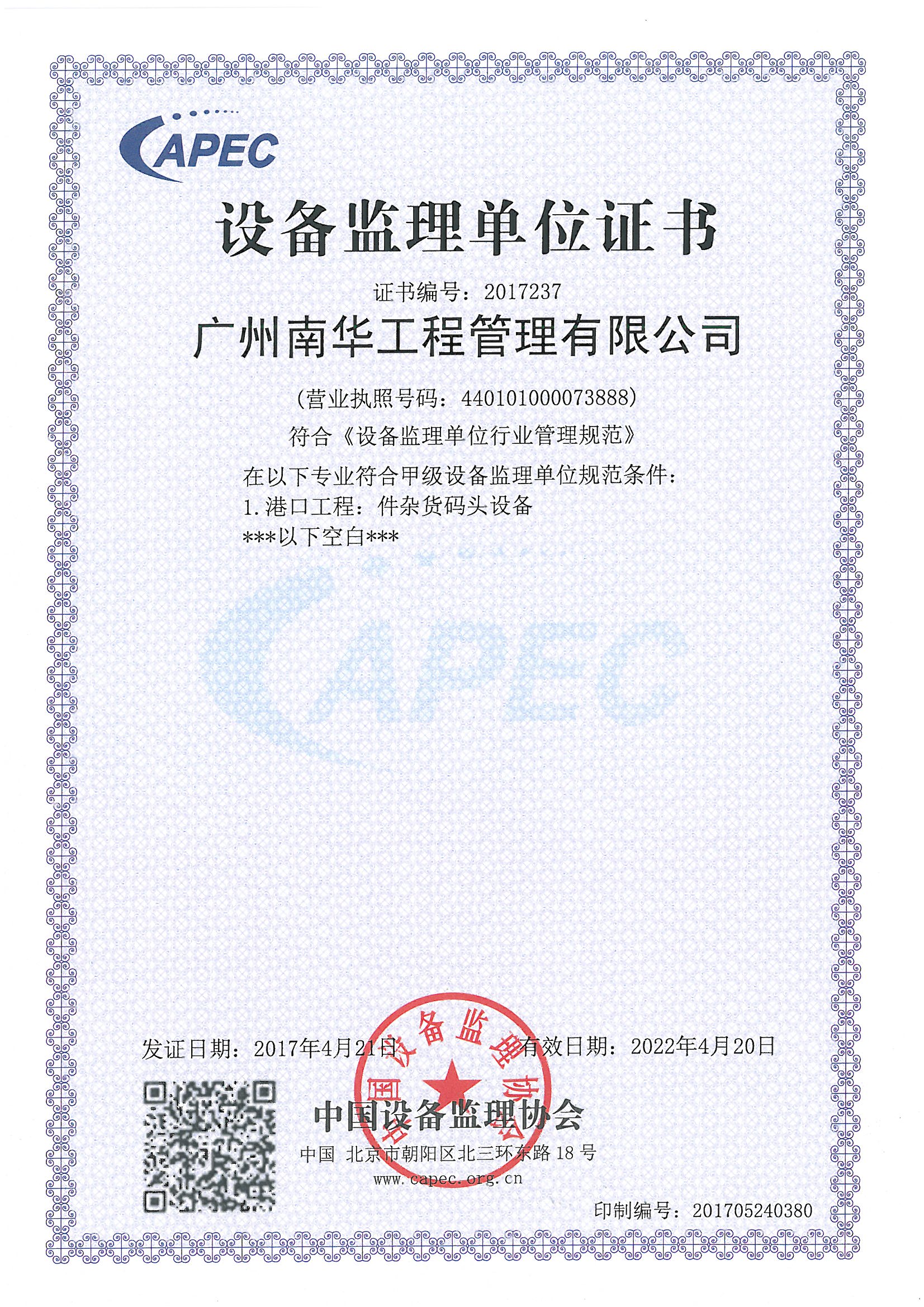 廣州南華工程管理有限公司獲“港口工程:件雜貨碼頭設備監理甲級”單位證書