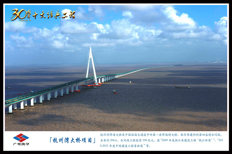 杭州灣跨海大橋是中國沿海大通道中的第一座跨海特大橋。南華參建的的第四監理合同段,全長約20km,合同段工程投資108億元。獲“2009年度浙江省建設工程‘錢江杯獎’”、“2010-2011年度中國建設工程魯班獎”等。