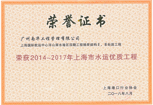 我公司監理的上海國際航運中心洋山深水港區四期接岸結構工程榮獲《2014~2017年上海市水運優質工程》獎。