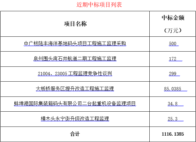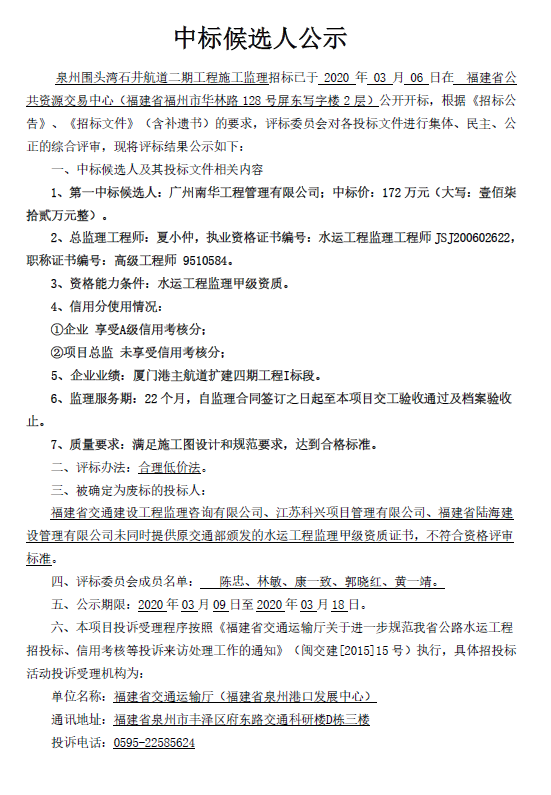 2020年3月9日,南華公司成功中標泉州圍頭灣石井航道二期工程施工監理,中標金額:172萬元。