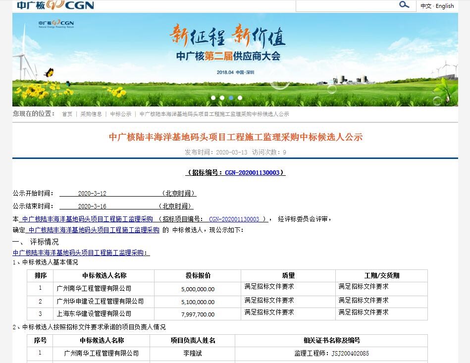 2020年3月12日,南華公司成功中標中廣核陸豐海洋基地碼頭項目工程施工監理采購,中標金額:500萬元。