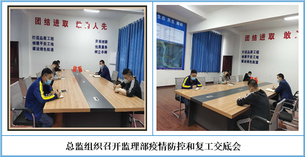 17時20分,總監(jiān)張總組織召開監(jiān)理部疫情防控和復(fù)工交底會,落實宣貫中交集團、公司、建設(shè)單位關(guān)于疫情防控和復(fù)工復(fù)產(chǎn)指南,并就監(jiān)理部疫情防控工作和現(xiàn)場疫情管控,復(fù)工條件核查以及復(fù)工后質(zhì)量、安全、環(huán)保管控進行了交底,要求大家提高站位、統(tǒng)一思想,盡快調(diào)整狀態(tài),疫情防控、復(fù)工復(fù)產(chǎn)兩手都要抓,兩手都要硬,做實做細疫情防控工作,有序推進復(fù)工復(fù)產(chǎn)。