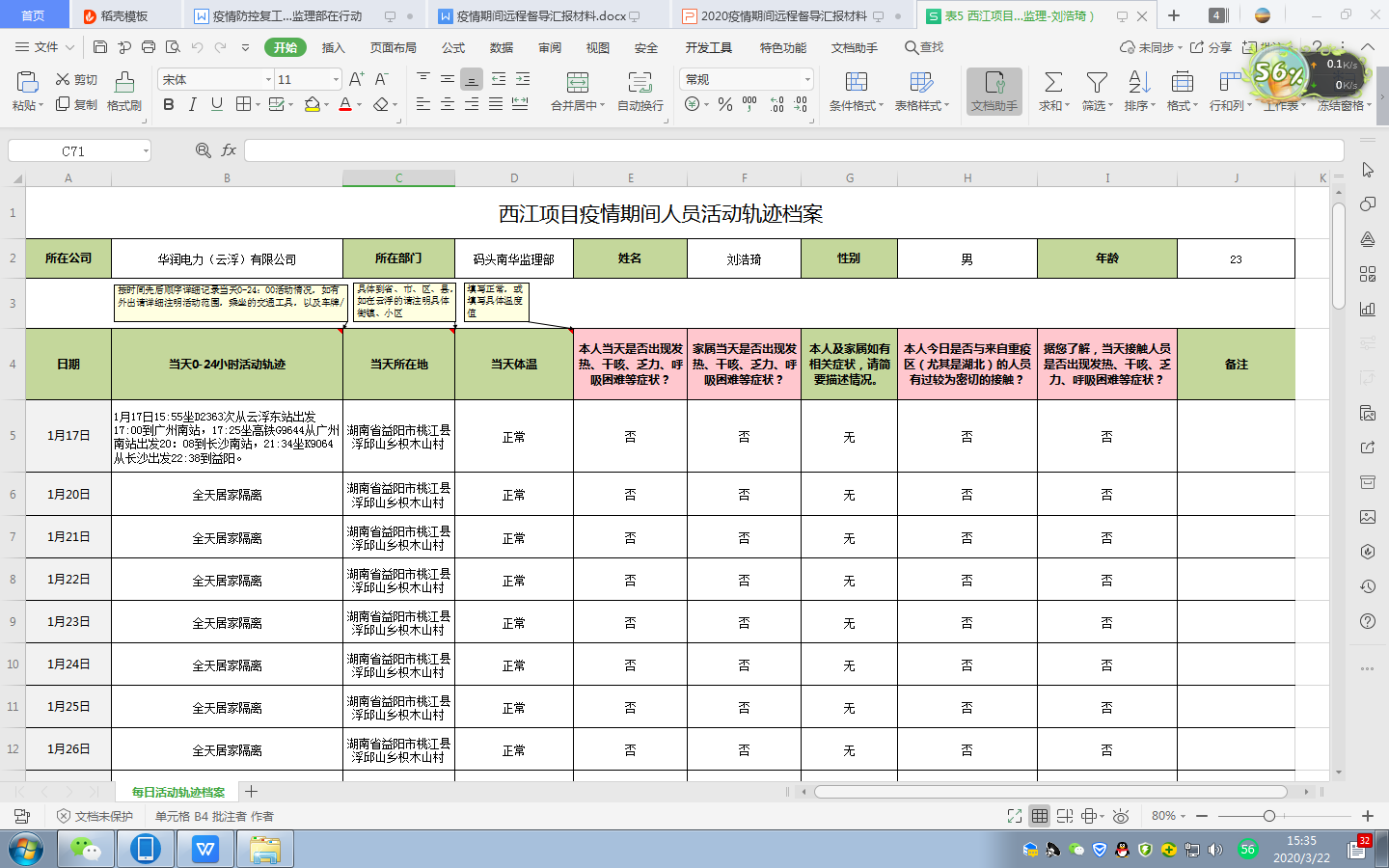 經嚴格排查,監理部無湖北籍員工,無近期有疫情重點地區旅行史或與重點疫情地區人員接觸史的員工,如實填報申請進場人員14天軌跡調查,并進行健康體檢報告,監理部共6人,檢查結果均正常。