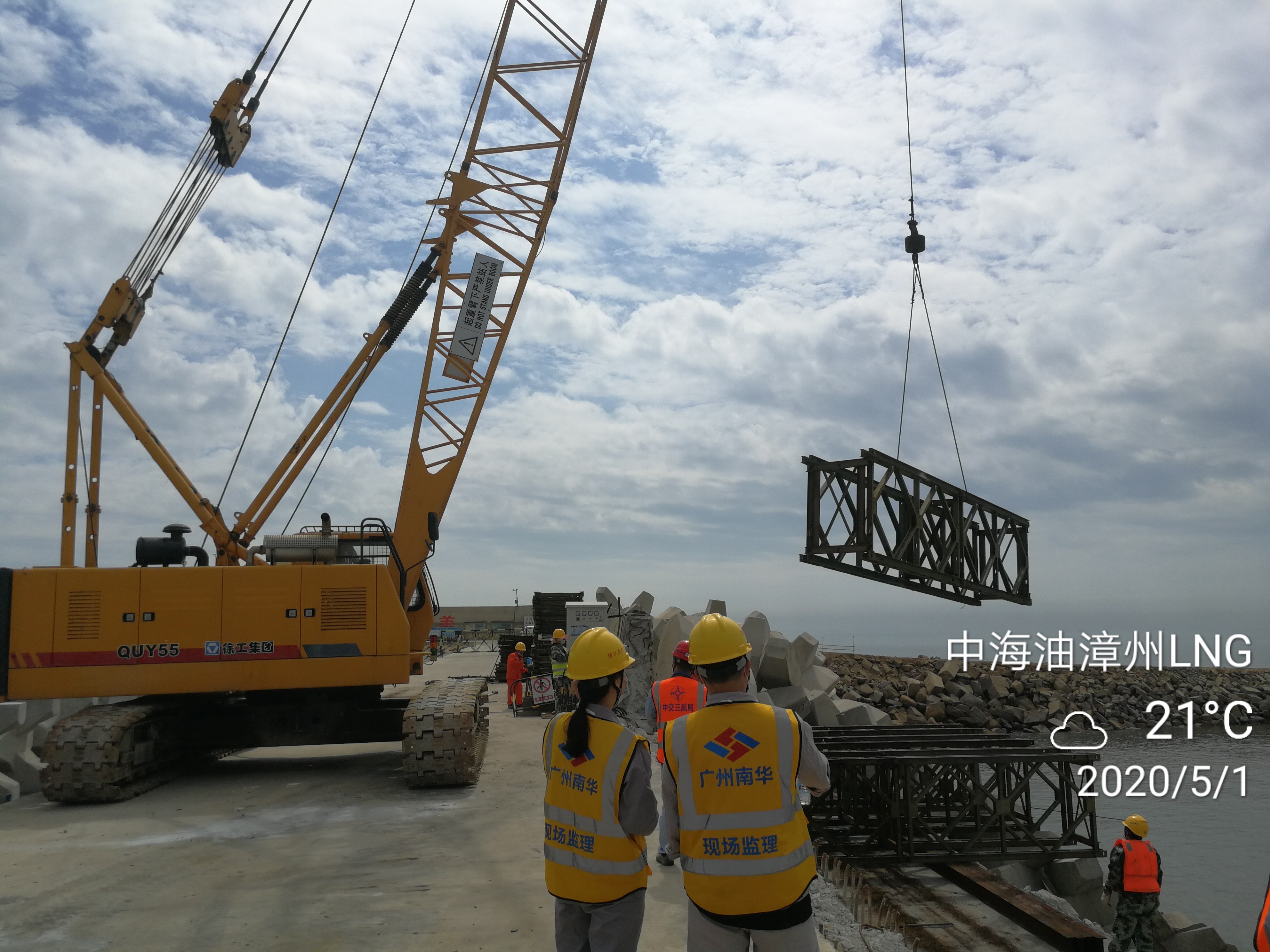 一、碼頭施工現場 ,工人們正在吊裝搭設碼頭施工作業平臺。