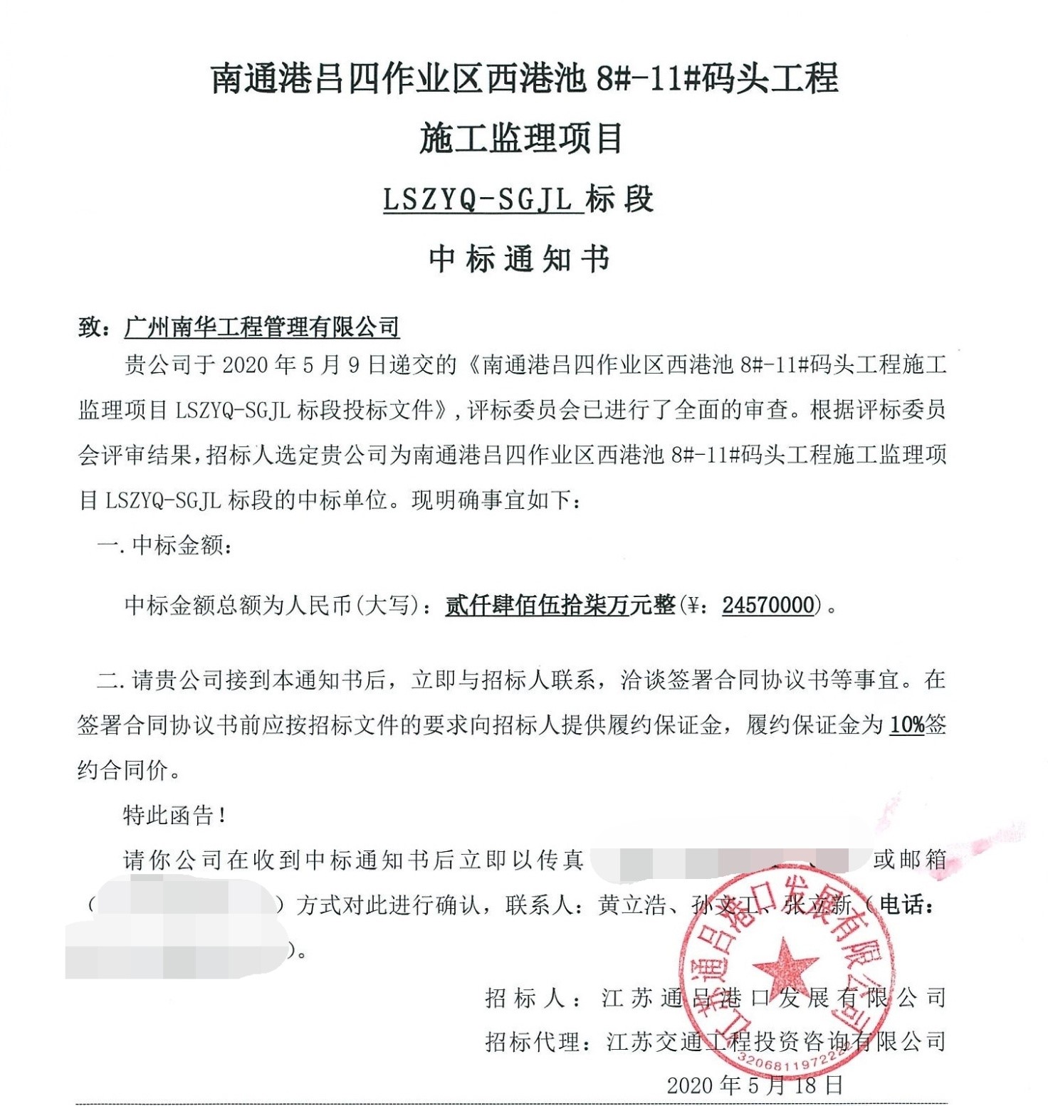 喜訊——南華公司中標(biāo)南通港呂四作業(yè)區(qū)西港池8#-11#碼頭工程施工監(jiān)理項目