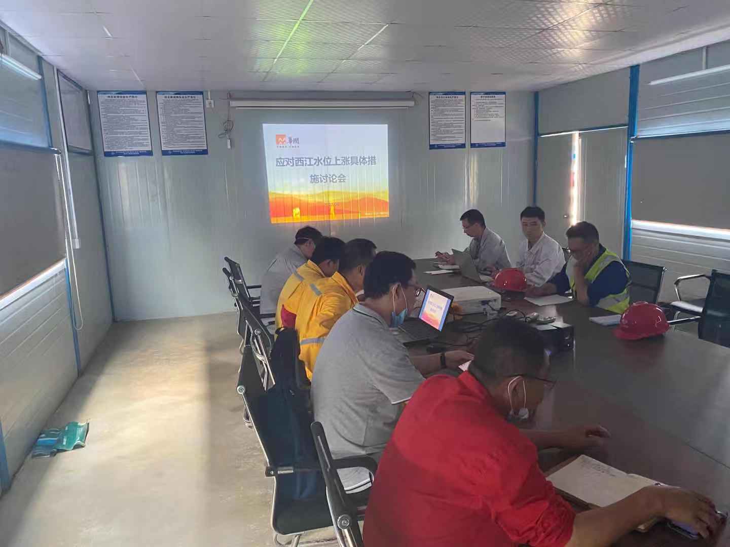 據氣象水文部門預測,西江今年可能遭遇2008年以來最大洪水,云浮地區有持續暴雨,局部大暴雨或特大暴雨,伴有8~9級雷暴大風,本碼頭工程又位于大水位差山區河段,易發生水位陡漲陡落的不利情況,對此,廣東華潤西江發電廠配套專用碼頭工程南華項目監理部于2020年6月6日14:30緊急組織召開防洪防汛專題會議,安排部署各項防御工作。