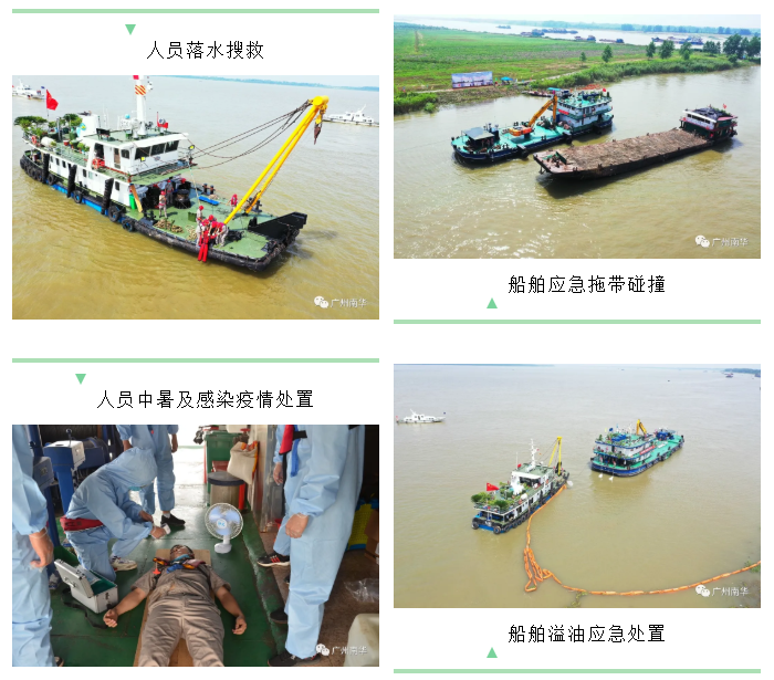 演練設置了四個科目;1、運輸塊石船舶突遇大風浪,船員落水搜救;2、運輸塊石船舶操作不當螺旋槳損壞失去動力,防碰撞應急拖帶;3、挖掘機操作人員中暑應急救護與感染新型冠狀的肺炎疫情;4、船舶尾部江江面出現油污,項目部立即組織溢油應急處置;本次應急演練參與人員合計約87人,參與船舶10艘:定位船“長貍10”、“應急拖輪宜工絞1”、海事巡視船舶“江海韻8號”、定位船“國運188”、海事救助船舶“海巡12236”、塊石運輸船舶“湘津市貨0667”、交通船“鄂州渡0021”航標船舶“漢道標314”、油污回收船舶“長潔1號”、汛期應急船舶“救絞1號”,及相關的演練器材、船舶通訊設備等。
