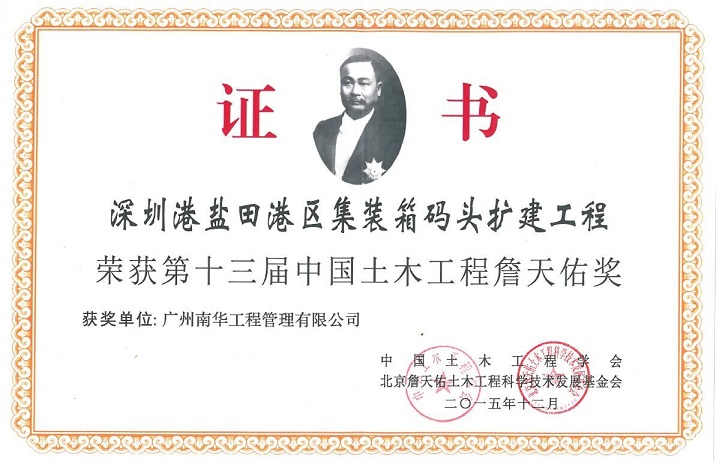 深圳港鹽田港區(qū)集裝箱碼頭擴(kuò)建工程榮獲第十三屆中國(guó)土木工程詹天佑獎(jiǎng)